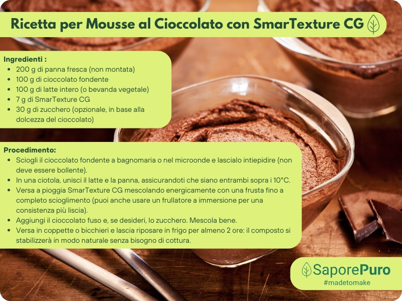 Ideale per mousse, gelée e gelatine di frutta, creme (es. bavarese, namelaka), ganache e altre preparazioni di pasticceria moderna. Permette di ottenere risultati professionali su strutture areate, gelificate o cremose, modulando il dosaggio dal ~2% al 7% a seconda della preparazione (percentuali più basse per mousse leggere, più alte per gelatine solide). Sia chef professionisti che appassionati di cucina tecnica troveranno in SmarTexture CG un alleato affidabile per innovare ricette classiche e creare dessert dalla texture perfetta.